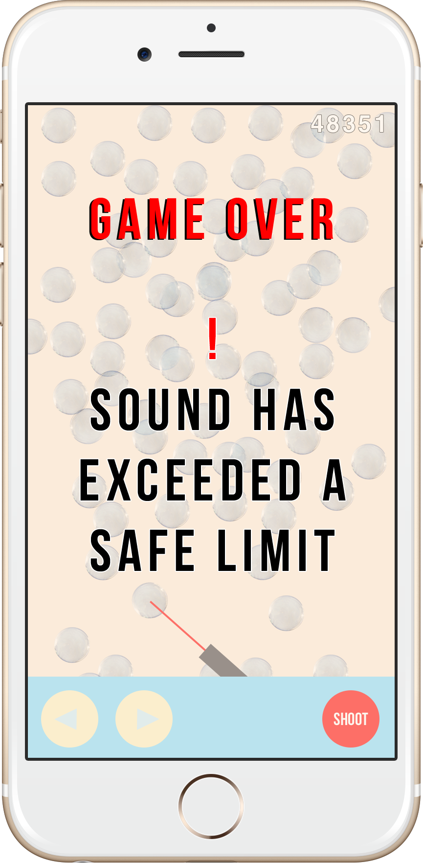I created a mobile game with the intention to raise awareness of hearing loss and deafness. The aim of the game is to pop as many bubbles as possible in order to keep the volume of noise playing through the headphones to a minimum. If too many bubbles build up, the volume exceeds a safe limit and therefore it’s game over.