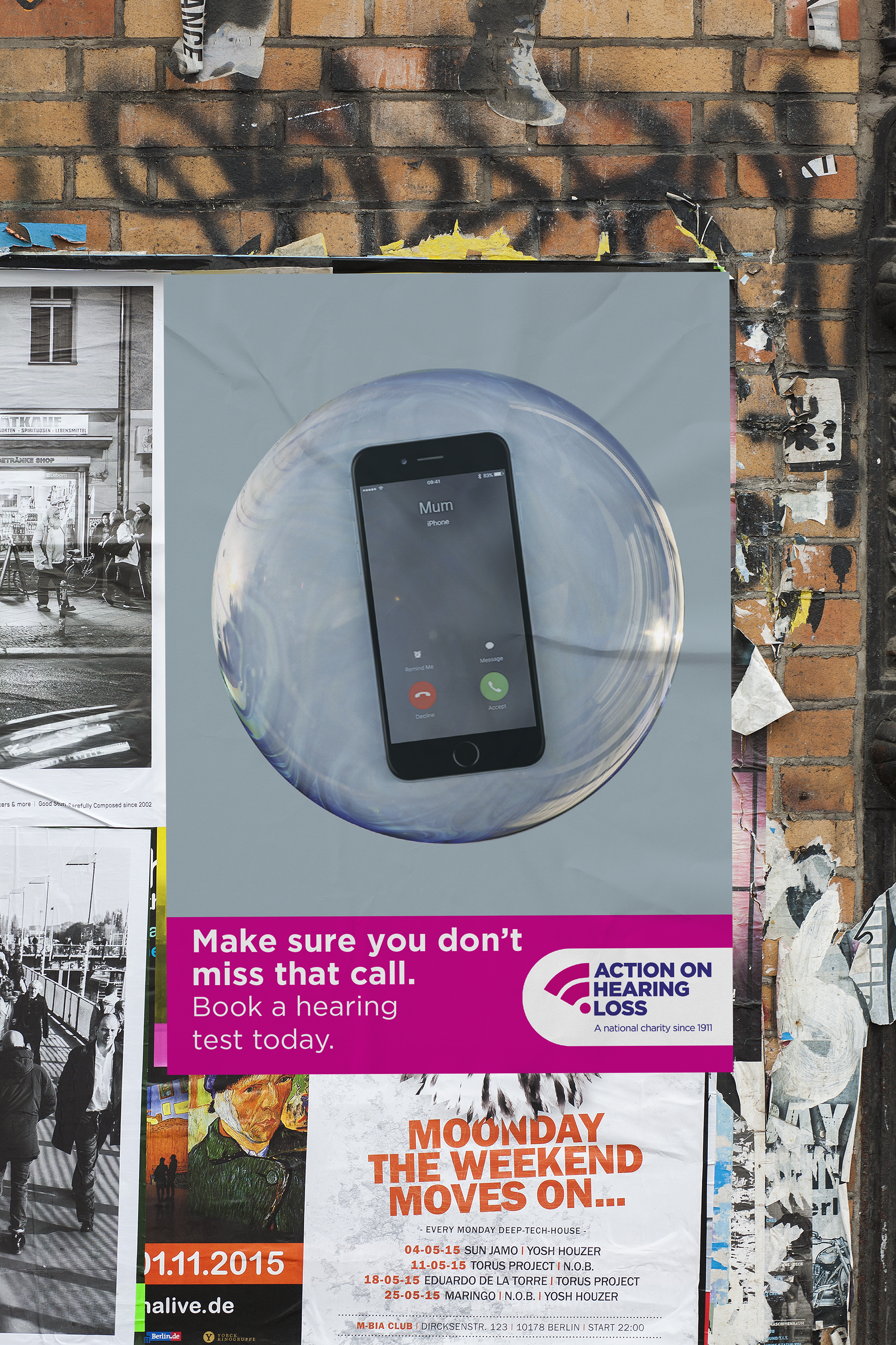 I decided to visualise hearing loss through the analogy of trapping anything that’s audible, inside a bubble. The bubbles feature throughout all touch-points in the campaign. Shown here are three of the posters I designed, keeping to the Action For Hearing Loss colour palette as stated in the brief.