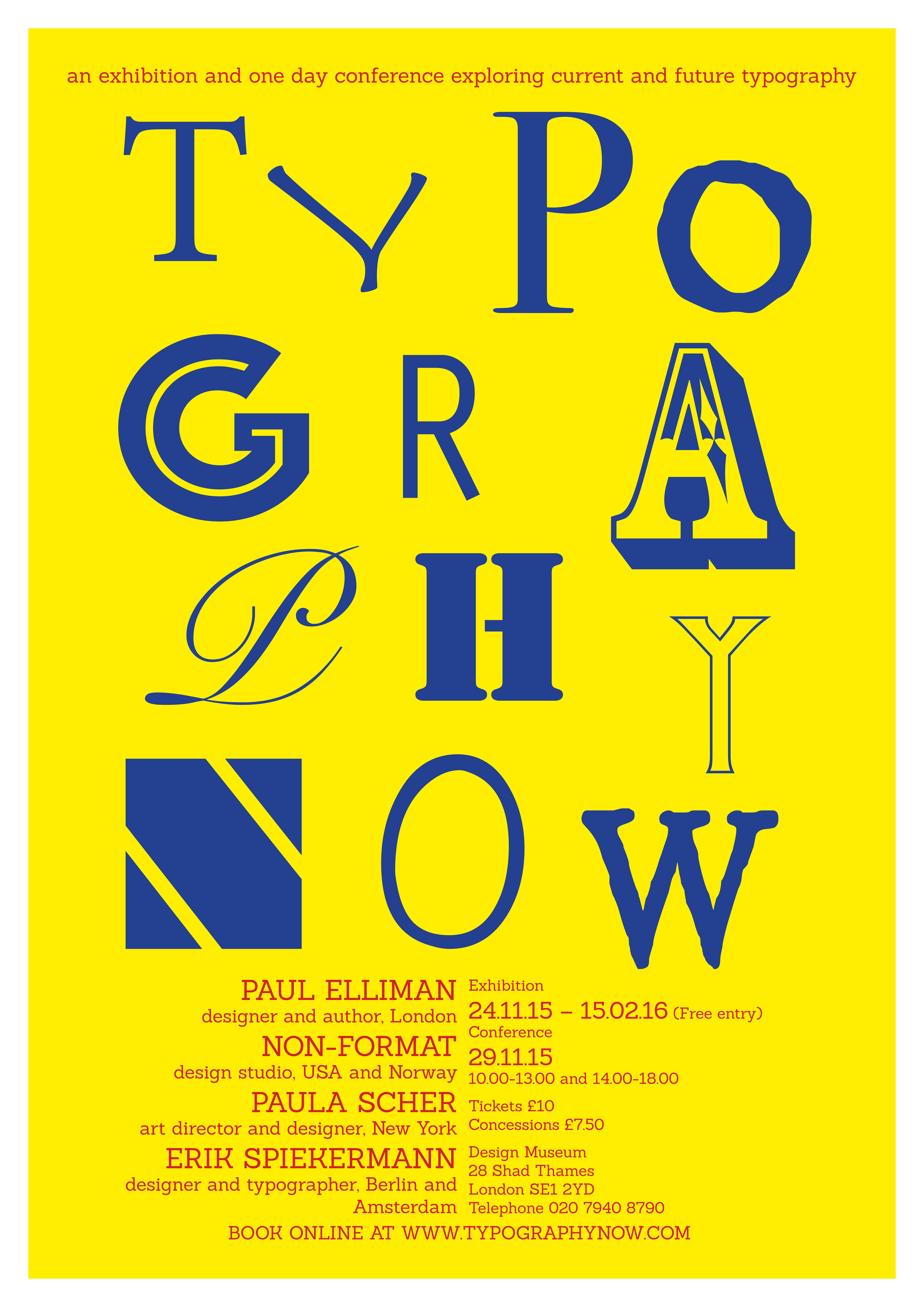 The brief was to create an A2 portrait poster promoting Typography Now! – a lecture series and exhibition about contemporary typography being held at the Design Museum in London this year. The poster was to be only typographic so I designed my poster with a range of different fonts, arranged in a cluster. I then used grids to align the informative section of the poster and I used bright colours to make it stand out in crowded areas.
